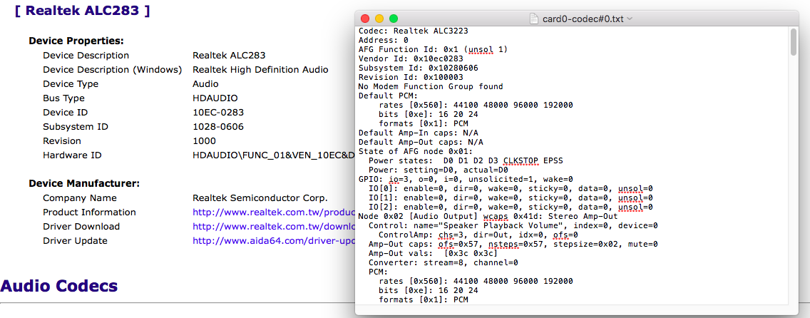Không có vấn đề gì đâu bạn, các codec của Realtek có thể xác định được tên ngay qua DeviceID, như của bạn là 0x10ec0283 thì sound card là ALC283, tuy nhiên codecdump hiển thị như vậy không sai nhé, một số model từ Haswell trở đi "có vẻ" như là có sự nâng cấp gì đó nên lấy 4 số đằng sau ALC (nâng cấp gì thì mình không có biết).