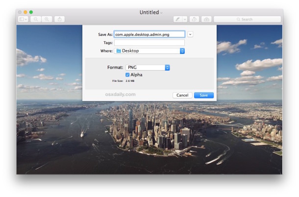 - Mở hình ảnh ứng dụng Preview và tái lưu nó như một tập tin PNG bằng cách vào File> Save As> và chọn PNG