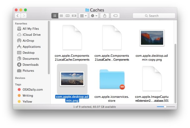 - Xác định vị trí các tập tin trong thư mục này được gọi là "com.apple.desktop.admin.png" và đổi tên nó thành "com.apple.desktop.admin-backup.png" hoặc một cái gì đó tương tự để bạn có thể khôi phục lại mặc định nếu bạn muốn
